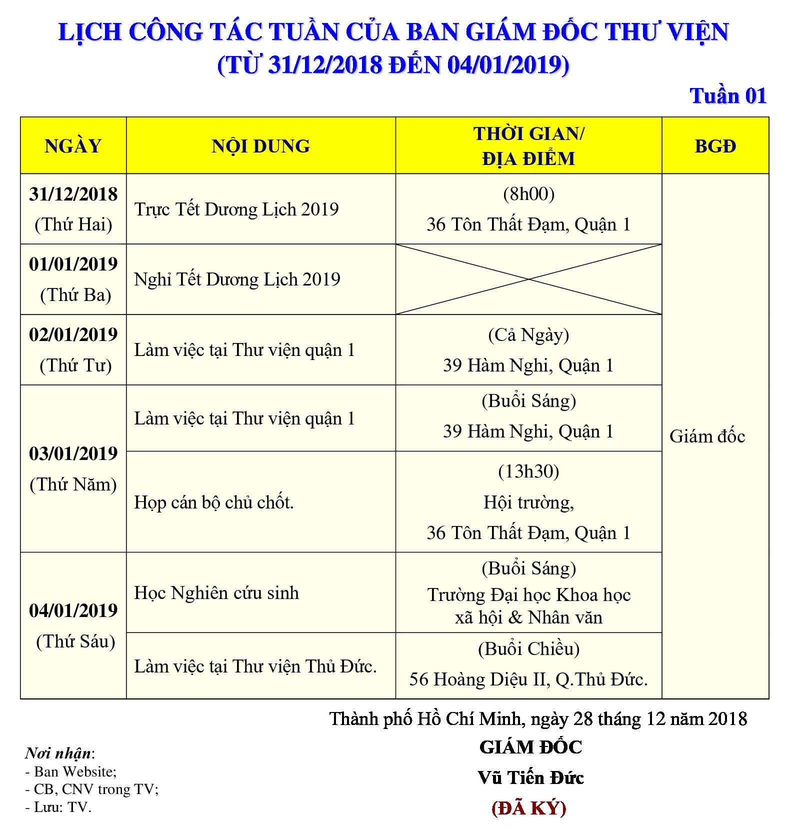 Lịch công tác tuần 01 của Ban Giám đốc Thư viện (từ 31/12/2018 đến 04/01/2019)