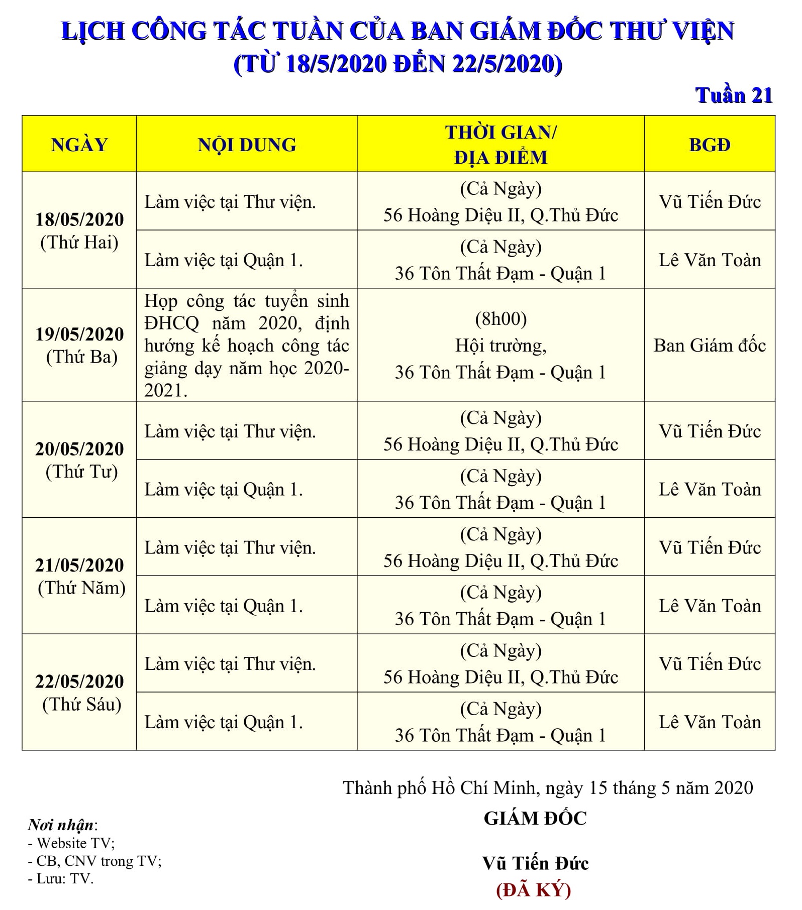 Lịch công tác tuần 21 của Ban Giám đốc Thư viện (từ 18/5/2020 đến 22/5/2020)