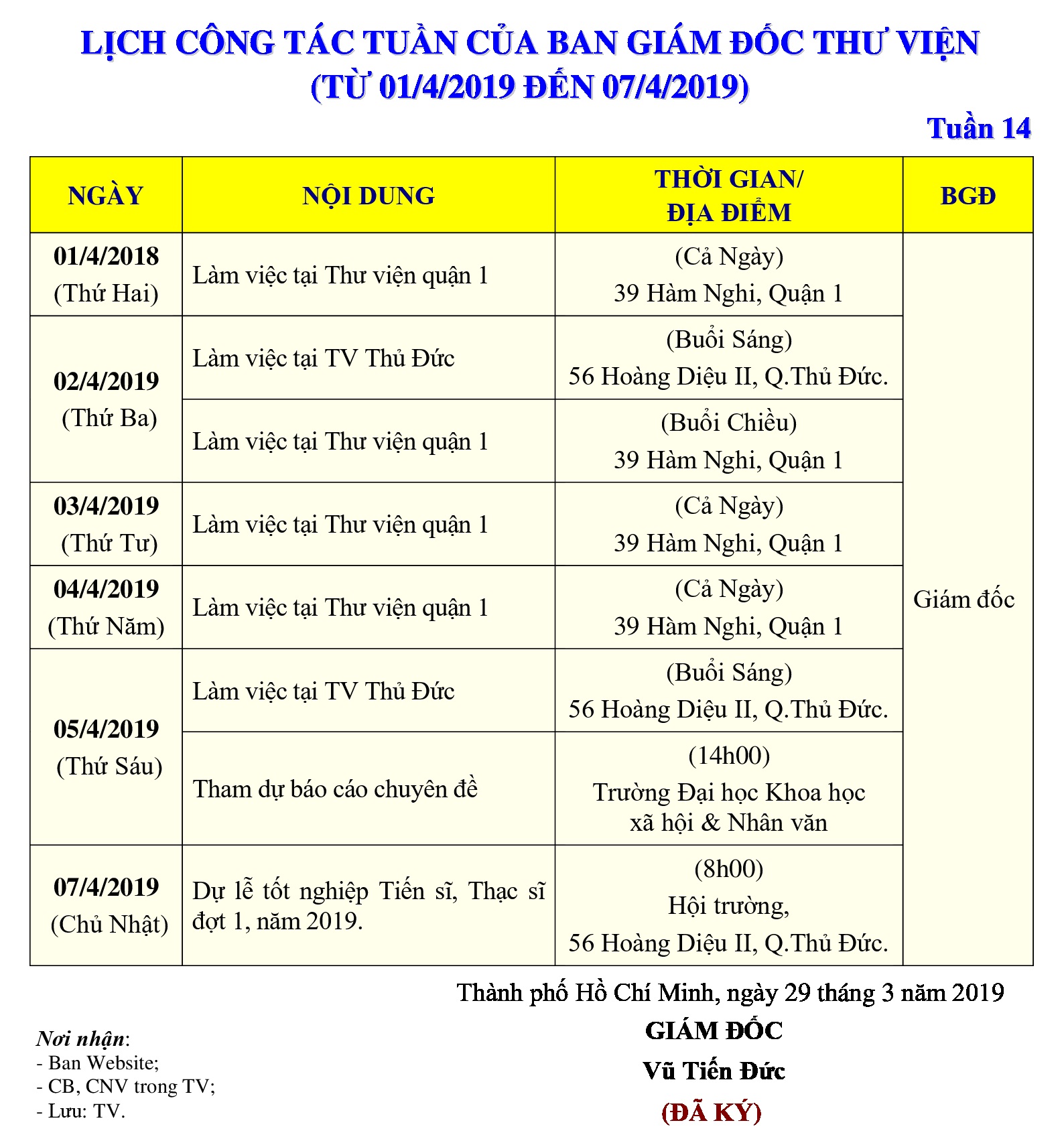 Lịch công tác tuần 14 của Ban Giám đốc Thư viện (từ 01/4/2019 đến 07/4/2019)