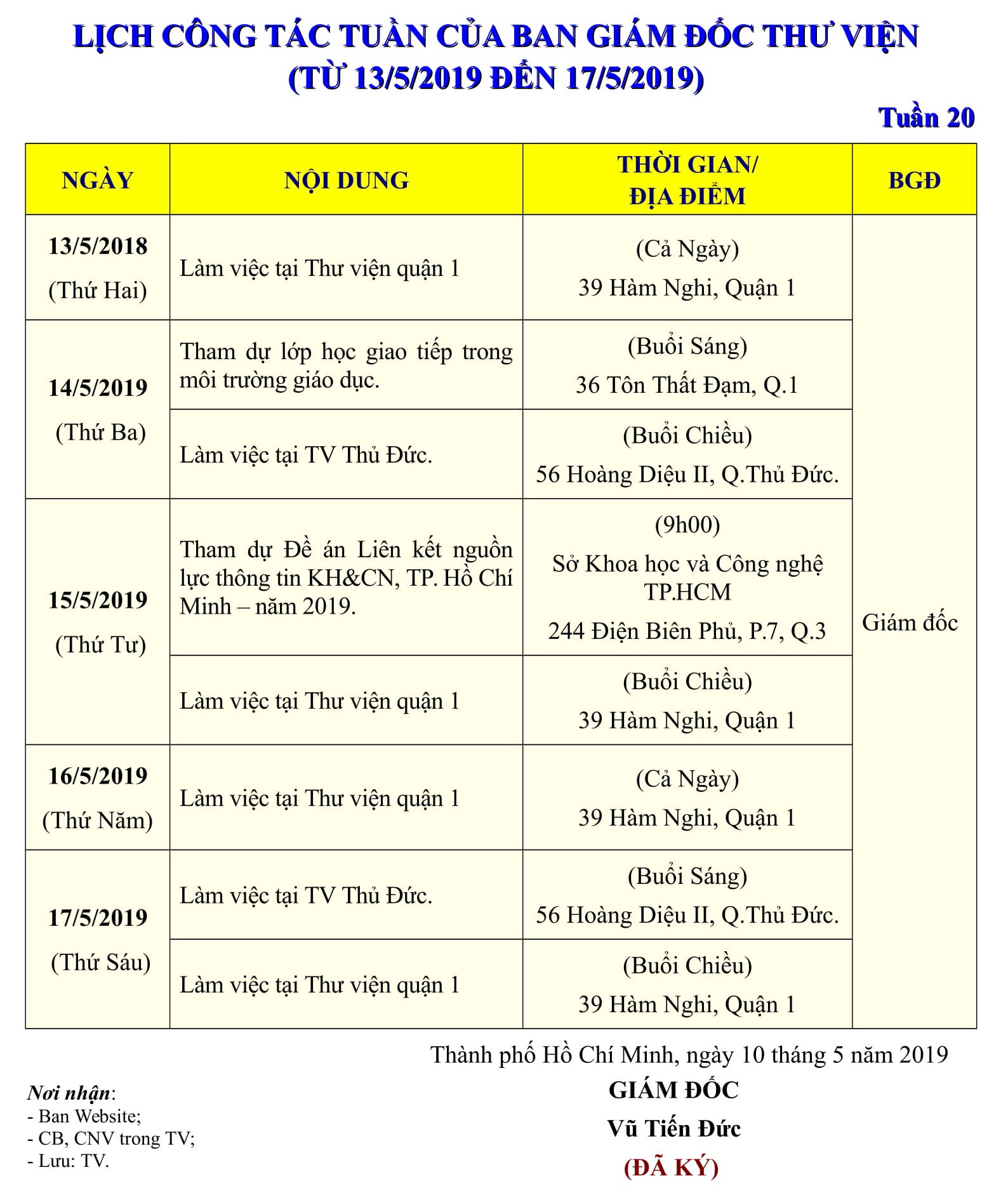Lịch công tác tuần 20 của Ban Giám đốc Thư viện (từ 13/5/2019 đến 17/5/2019)