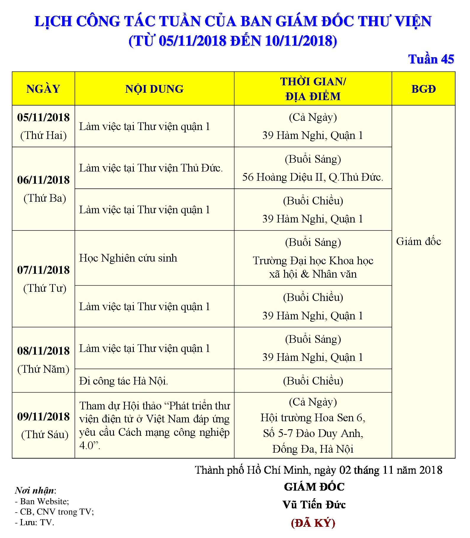 Lịch công tác tuần 45 của Ban Giám đốc Thư viện (từ 05/11/2018 đến 10/11/2018)