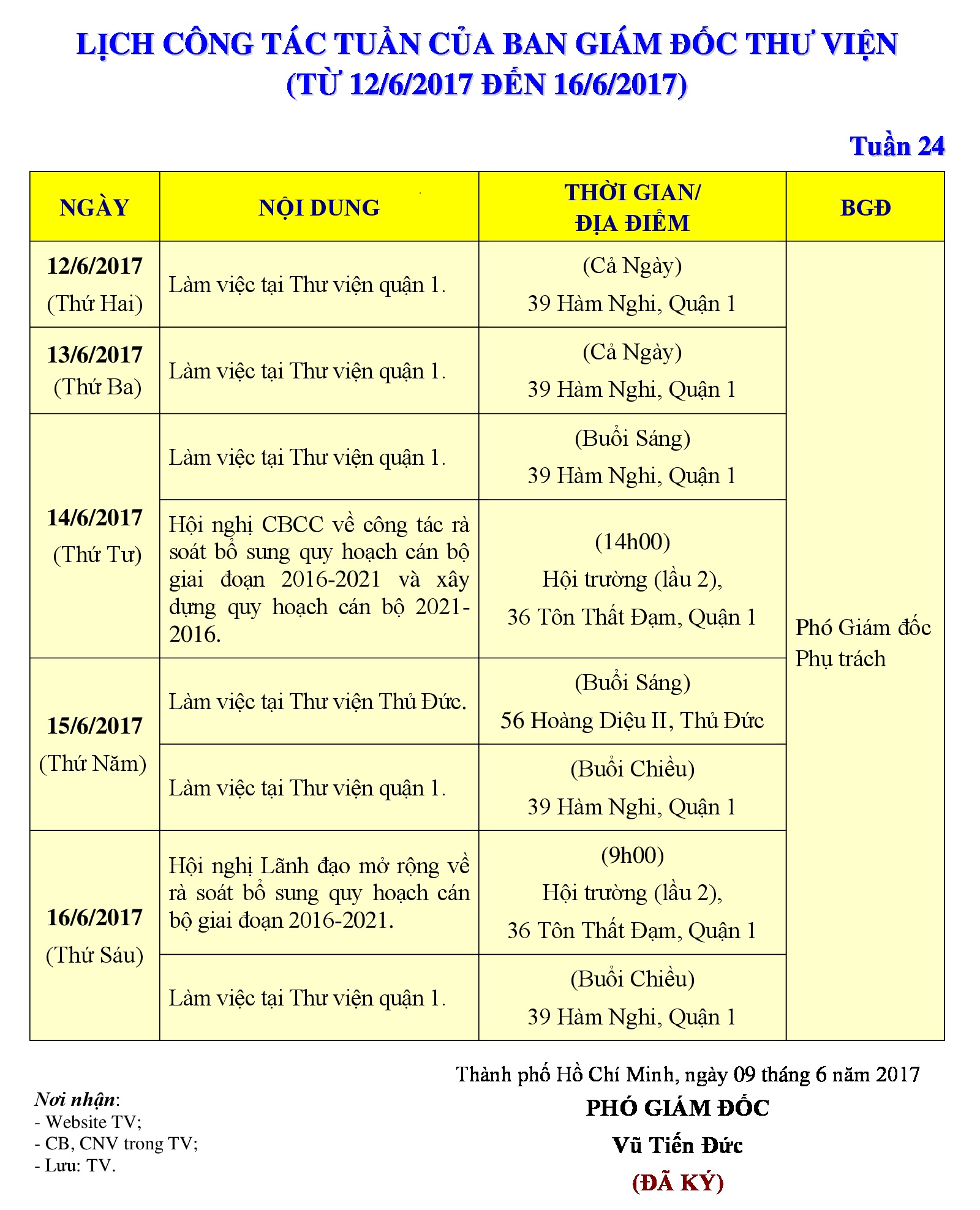 Lịch công tác tuần 24 của Ban Giám đốc Thư viện (từ 12/6/2017 đến 16/6/2017)