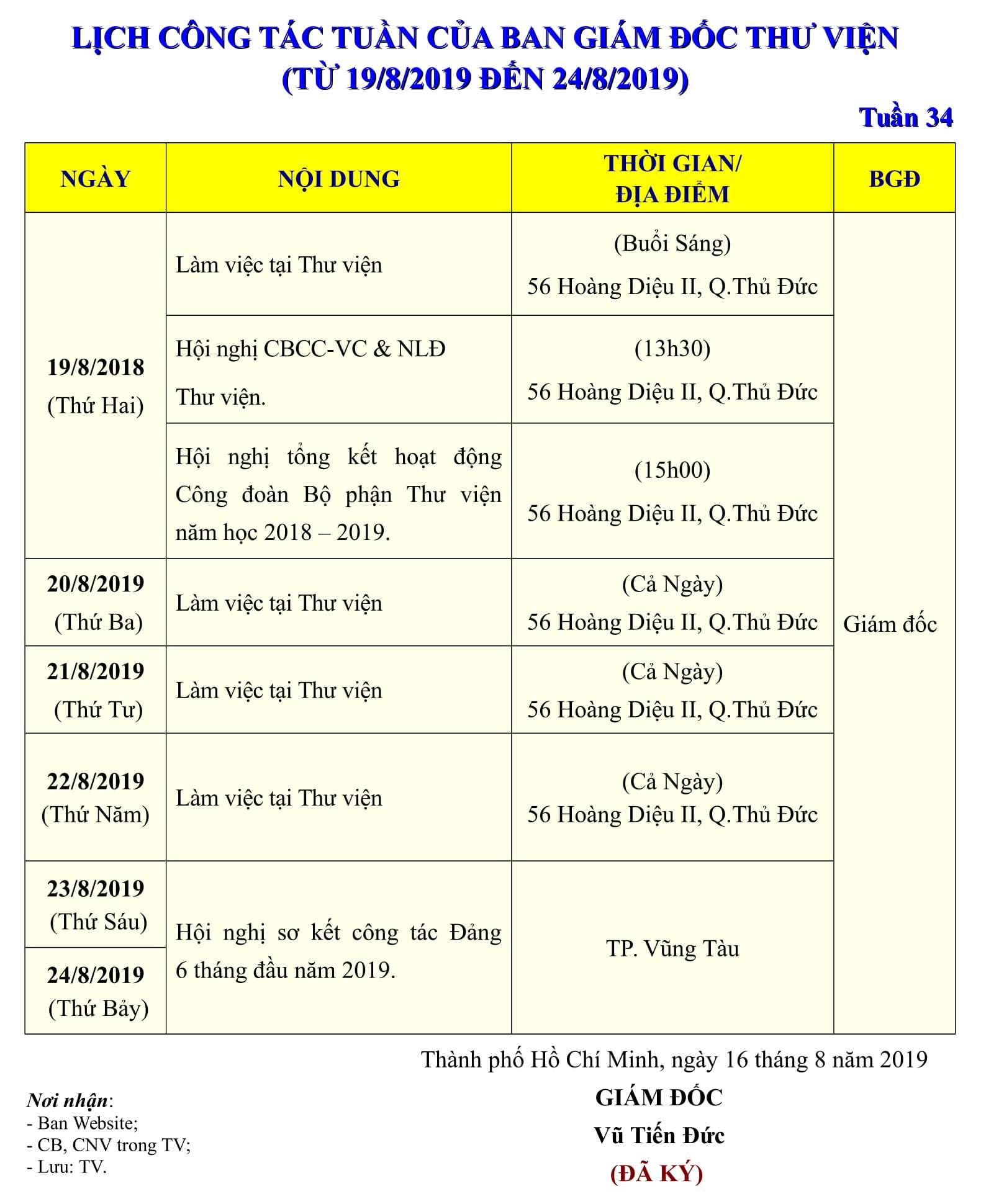 Lịch công tác tuần 34 của Ban Giám đốc Thư viện (từ 19/8/2019 đến 24/8/2019)