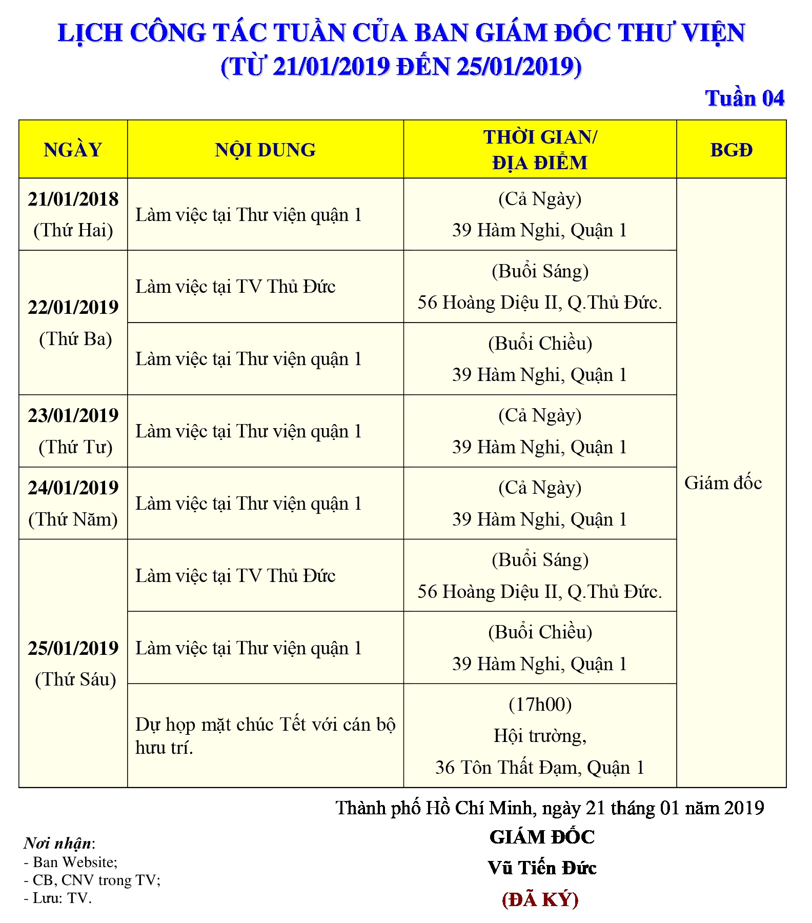 Lịch công tác tuần 04 của Ban Giám đốc Thư viện (từ 21/01/2019 đến 25/01/2019)