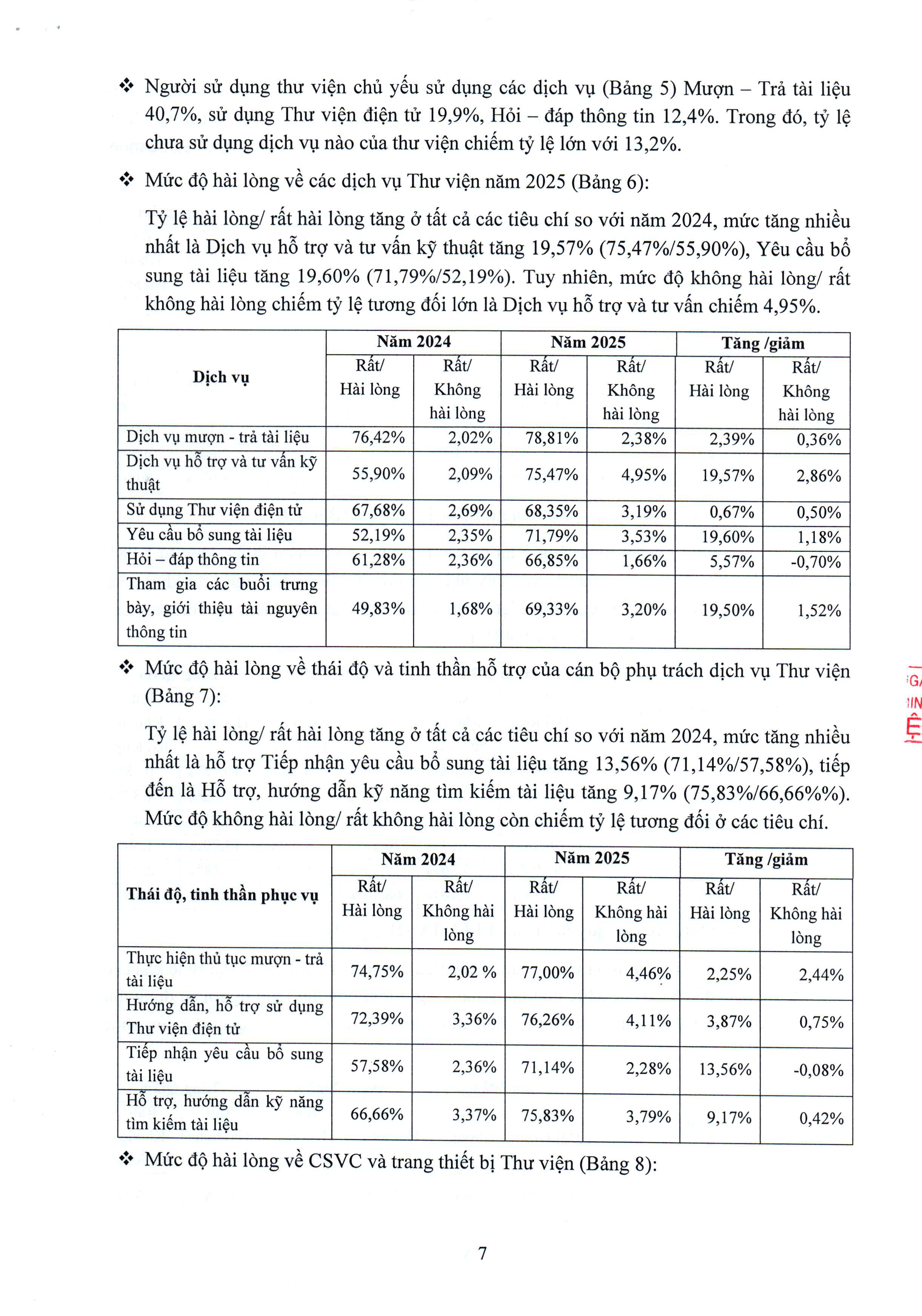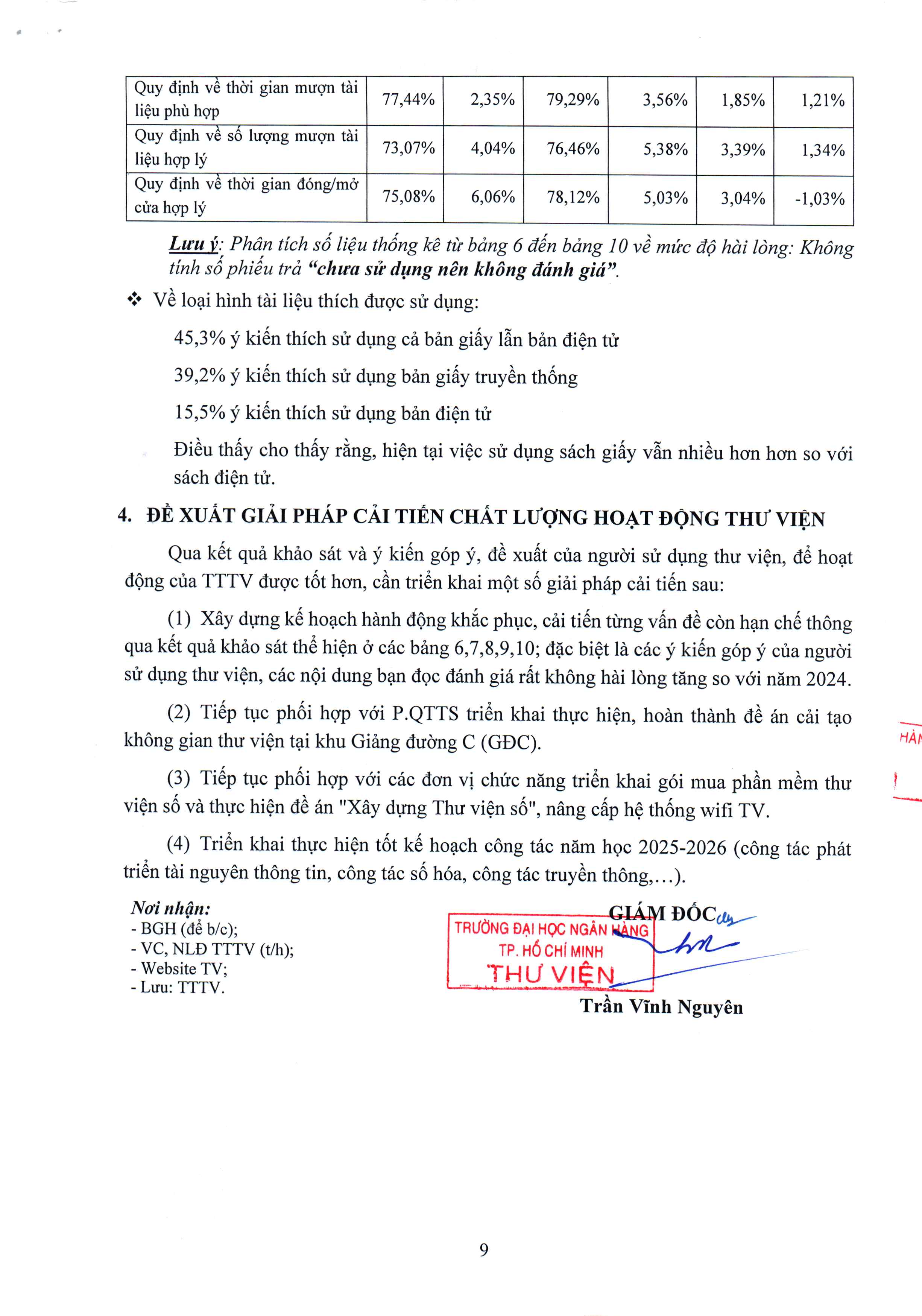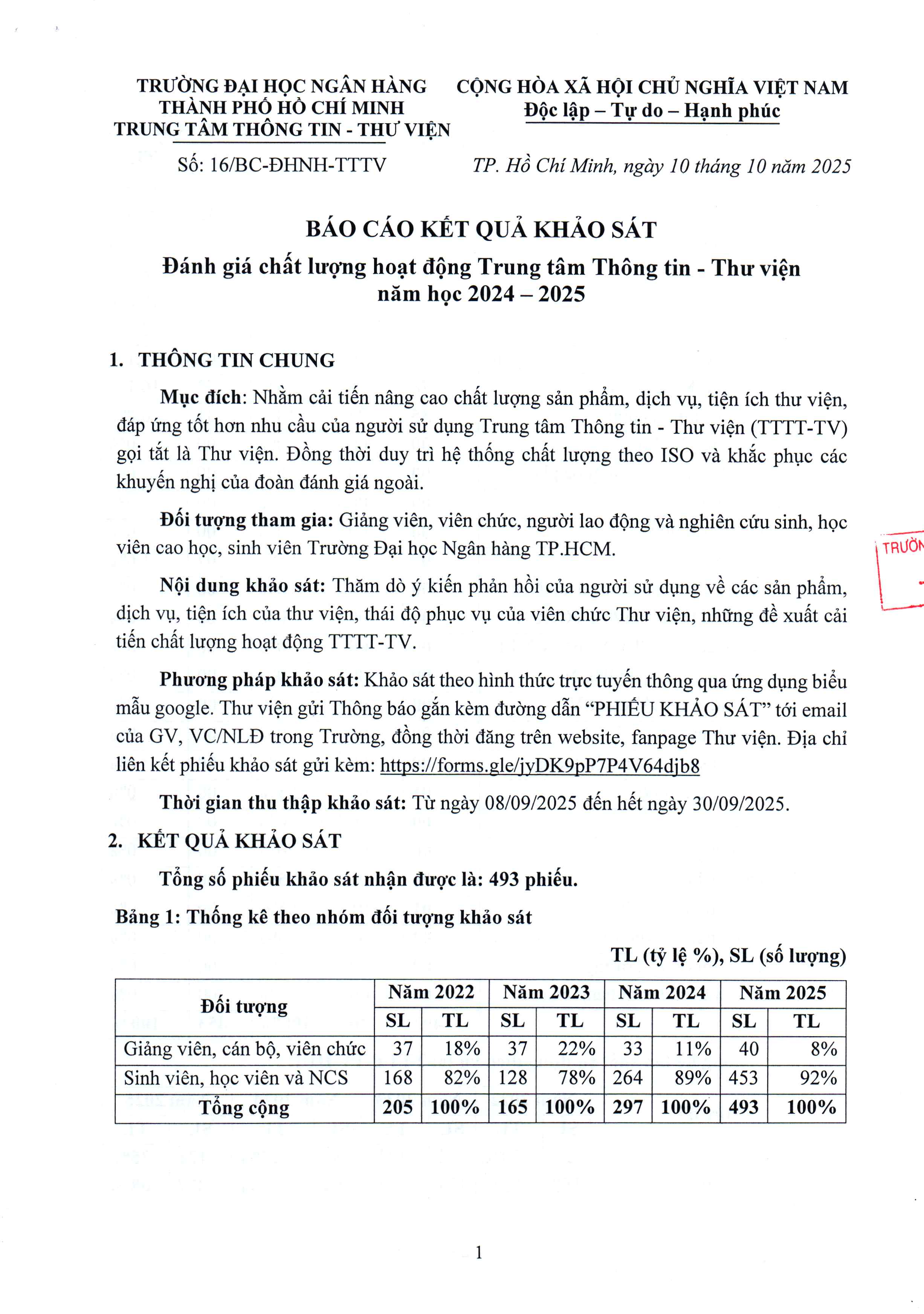 Báo cáo kết quả khảo sát về việc đánh giá chất lượng hoạt động Thư viện năm học 2024-2025