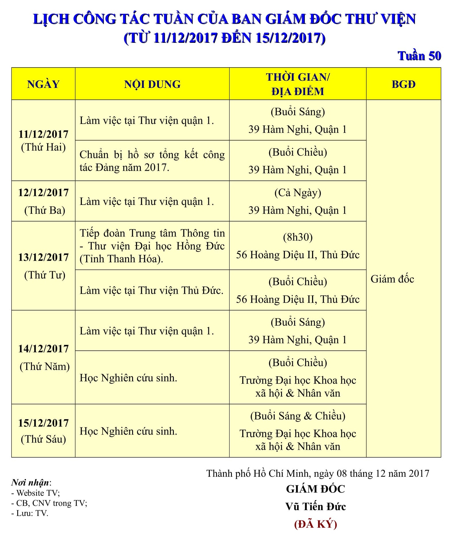 Lịch công tác tuần 50 của Ban Giám đốc Thư viện (từ 11/12/2017 đến 15/12/2017)
