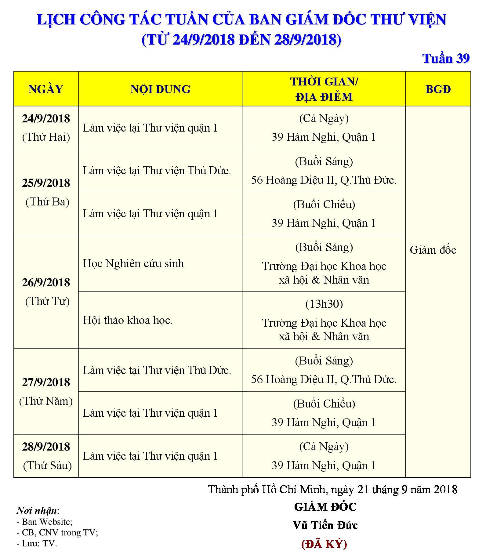 Lịch công tác tuần 39 của Ban Giám đốc Thư viện (từ 24/9/2018 đến 28/9/2018)