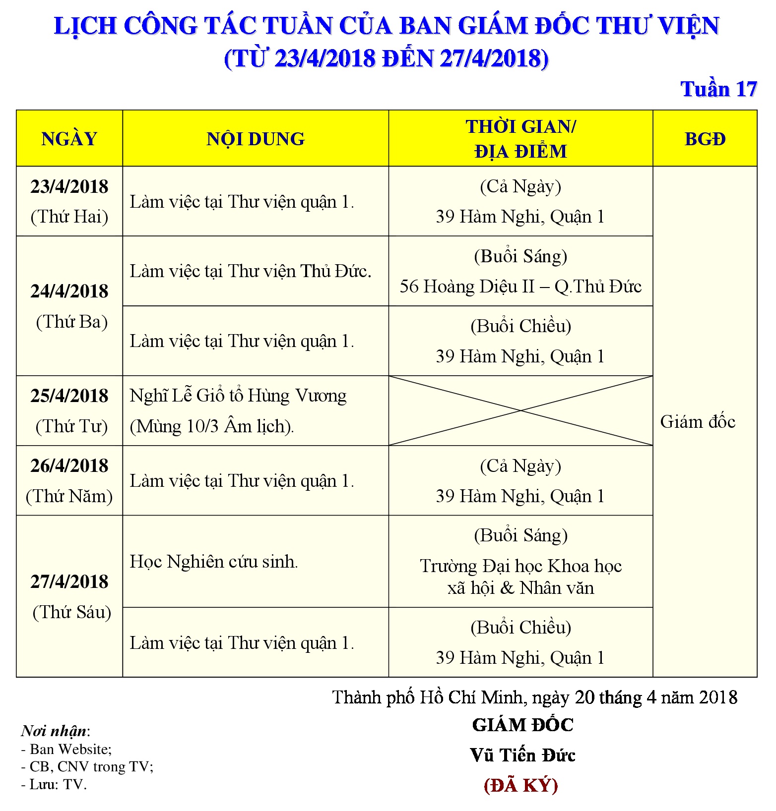 Lịch công tác tuần 17 của Ban Giám đốc Thư viện (từ 23/4/2018 đến 27/4/2018)