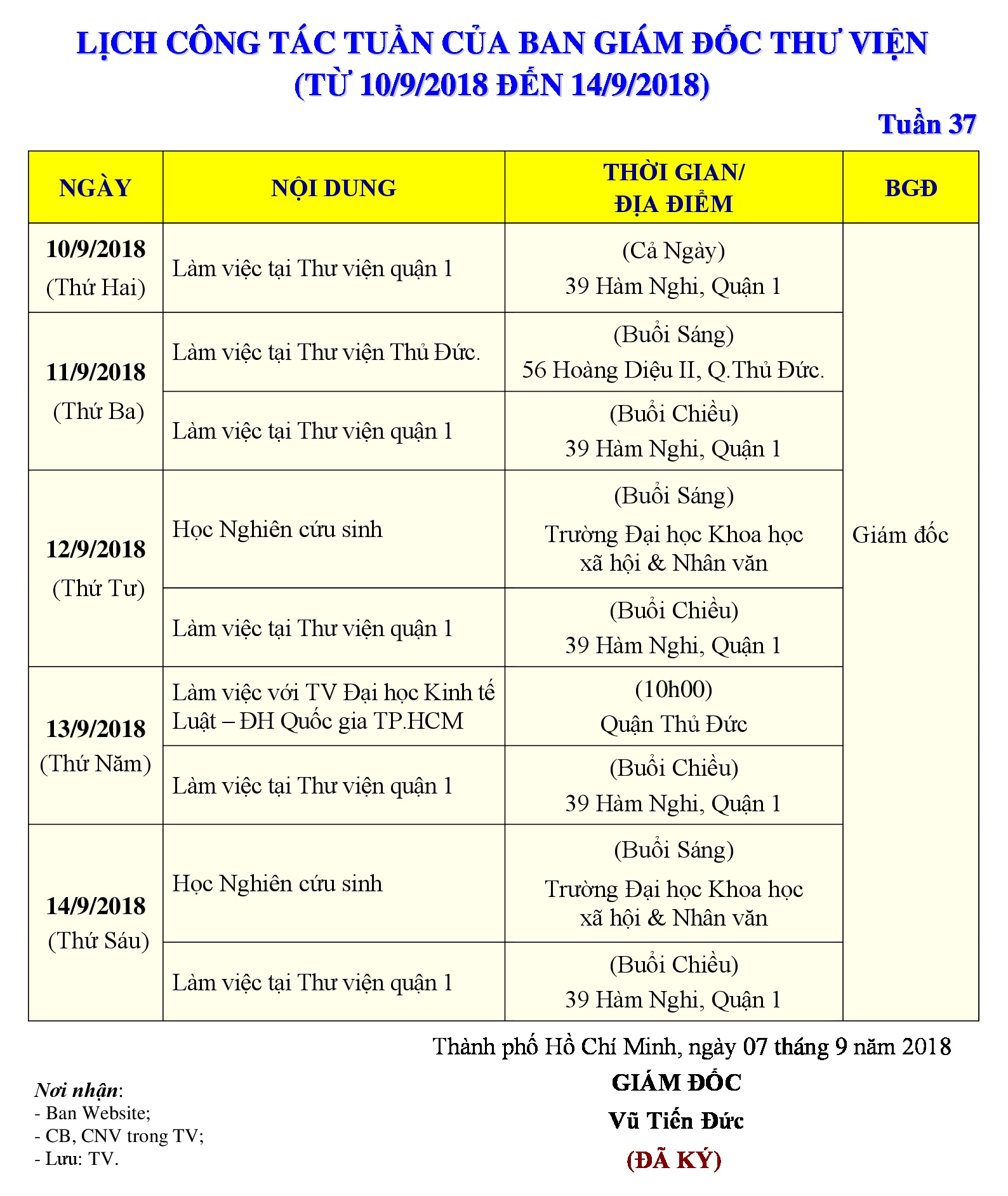 Lịch công tác tuần 37 của Ban Giám đốc Thư viện (từ 10/9/2018 đến 14/9/2018)