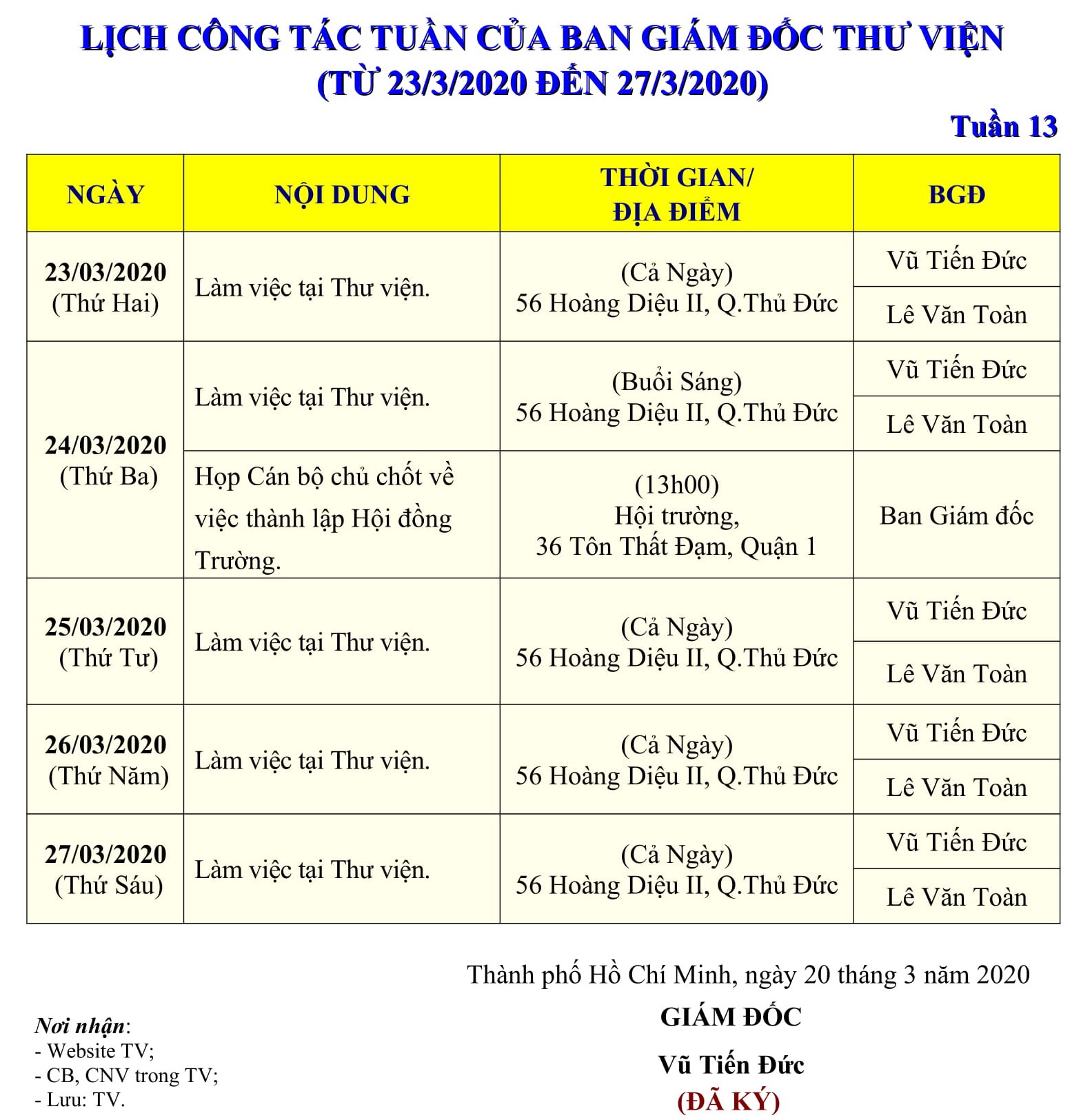 Lịch công tác tuần 13 của Ban Giám đốc Thư viện (từ 23/03/2020 đến 27/03/2020)