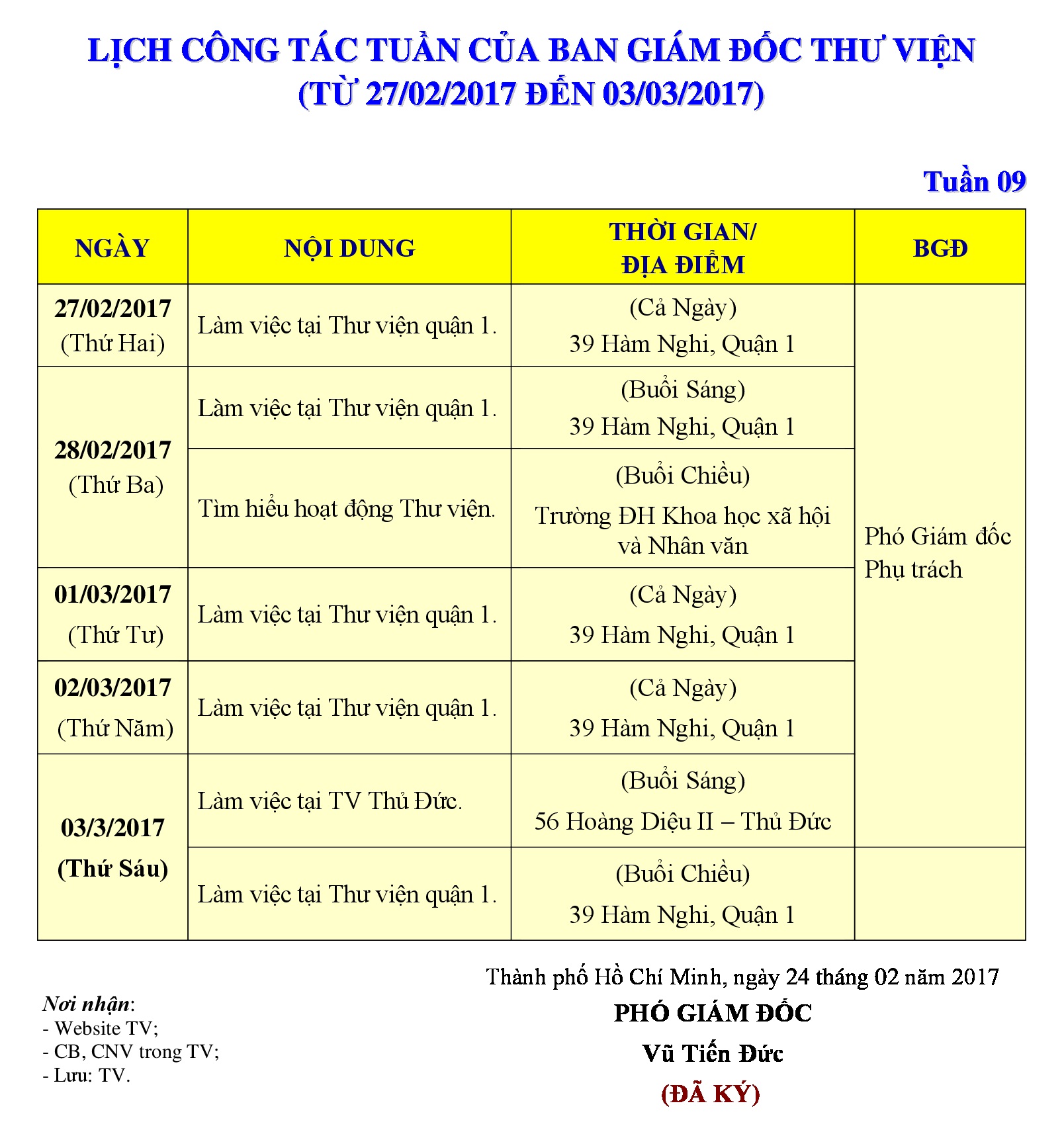 Lịch công tác tuần 09 của Ban Giám đốc Thư viện (từ 27/02/2017 đến 03/03/2017)