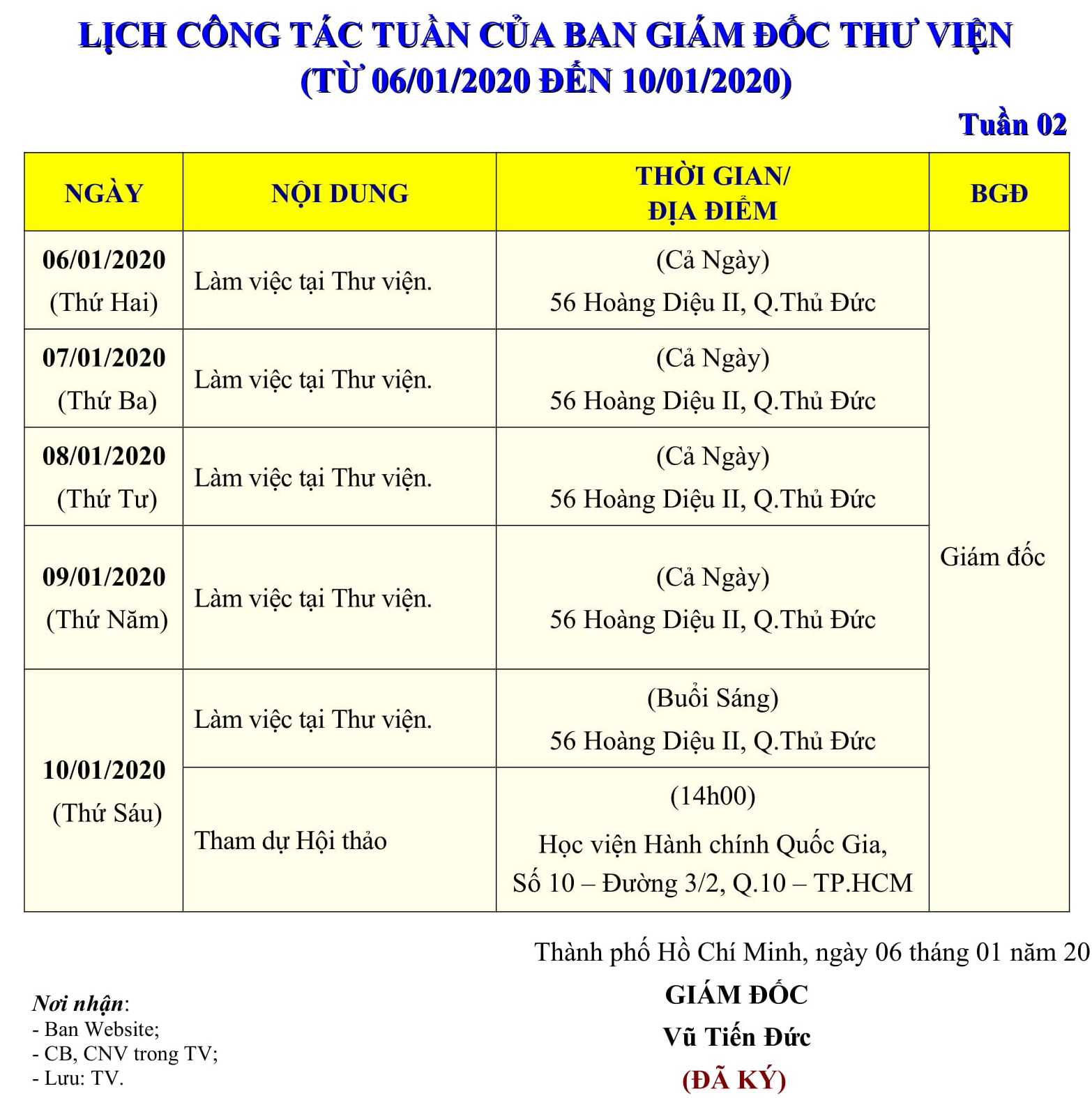 Lịch công tác tuần 02 của Ban Giám đốc Thư viện (từ 06/01/2020 đến 10/01/2020)