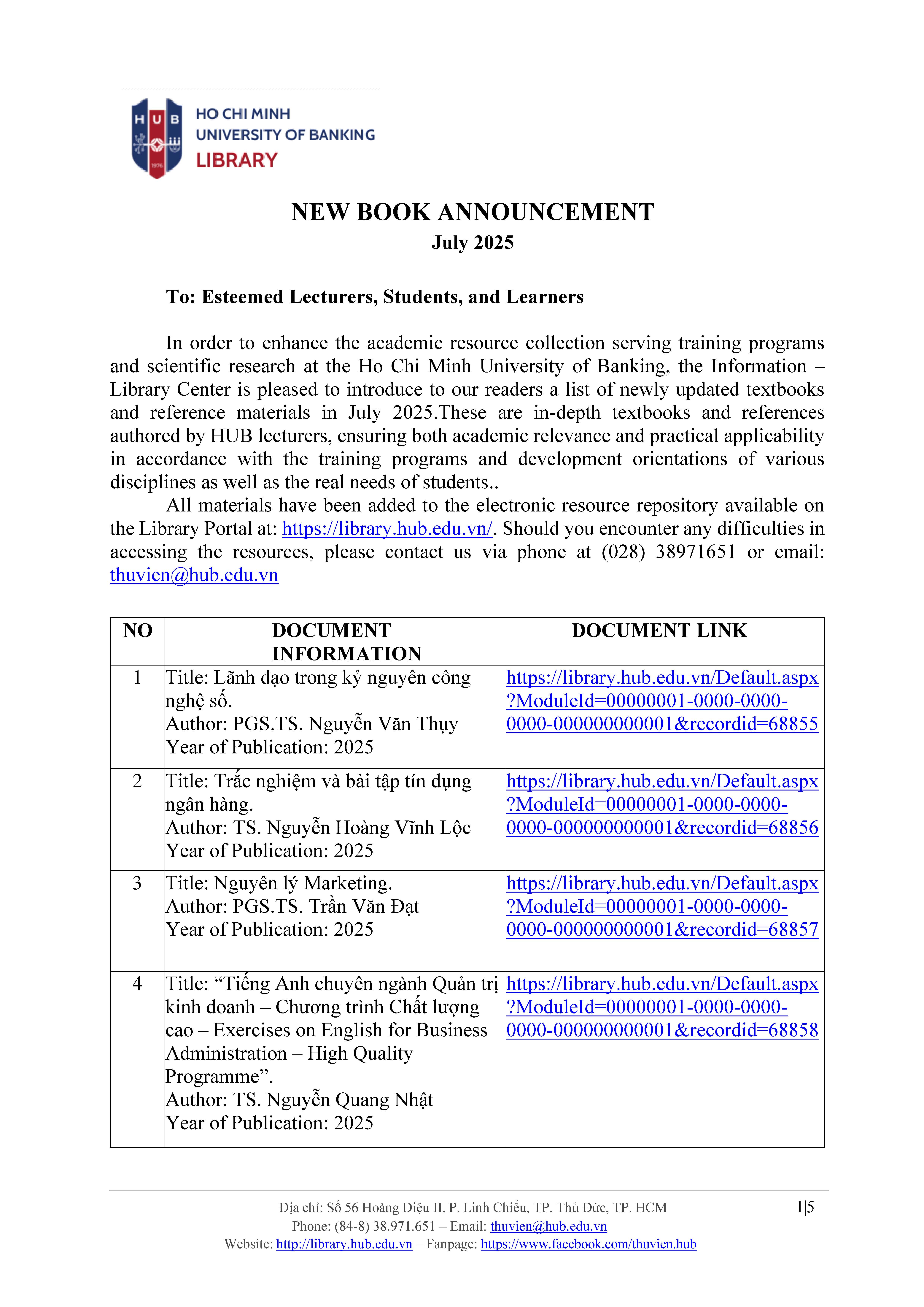 In order to enhance the academic resource collection serving training programs and scientific research at the Ho Chi Minh University of Banking, the Information – Library Center is pleased to introduce to our readers a list of newly updated textbooks and reference materials in July 2025.These are in-depth textbooks and references authored by HUB lecturers, ensuring both academic relevance and practical applicability in accordance with the training programs and development orientations of various disciplines as well as the real needs of students. (Details)