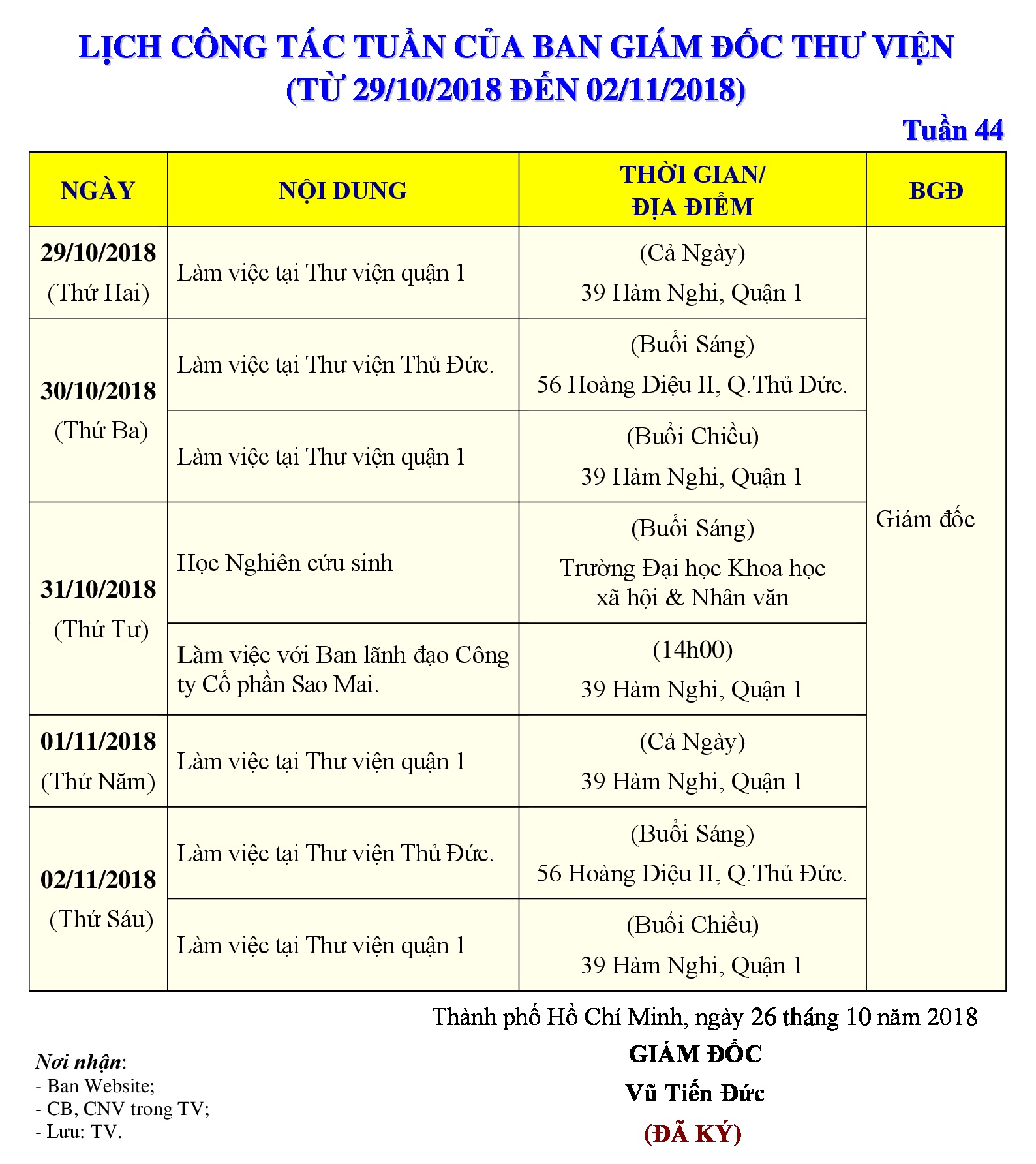 Lịch công tác tuần 44 của Ban Giám đốc Thư viện (từ 29/10/2018 đến 02/11/2018)