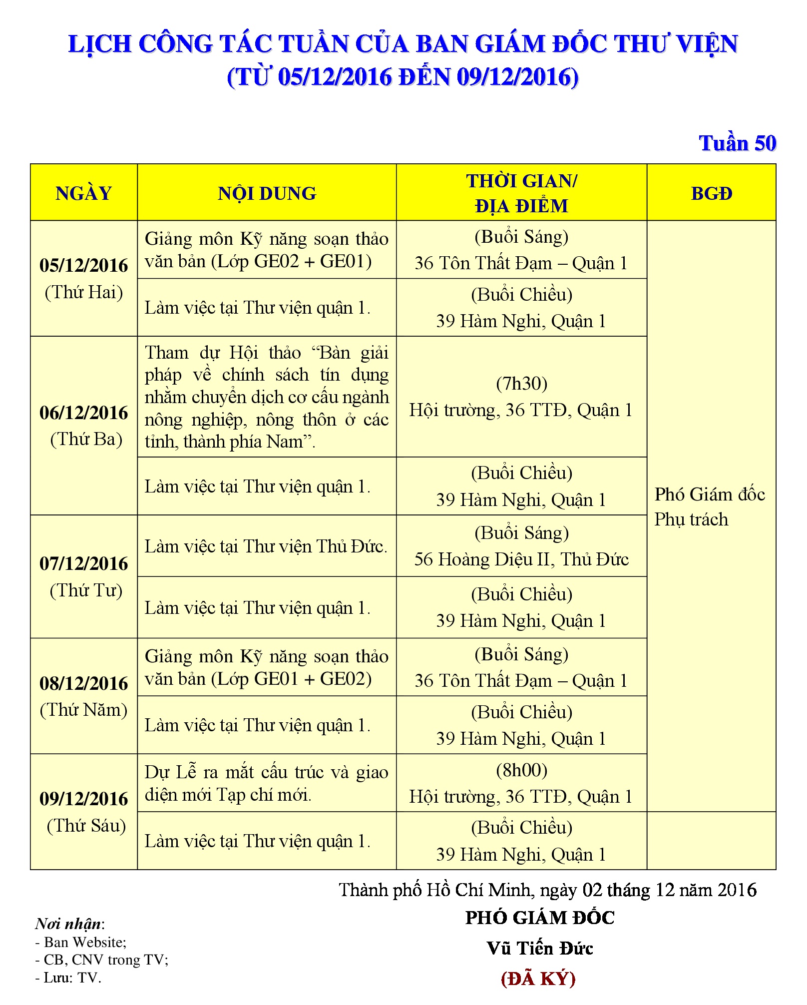 Lịch công tác tuần 50 của Ban Giám đốc Thư viện (từ 05/12/2016 đến 09/12/2016)