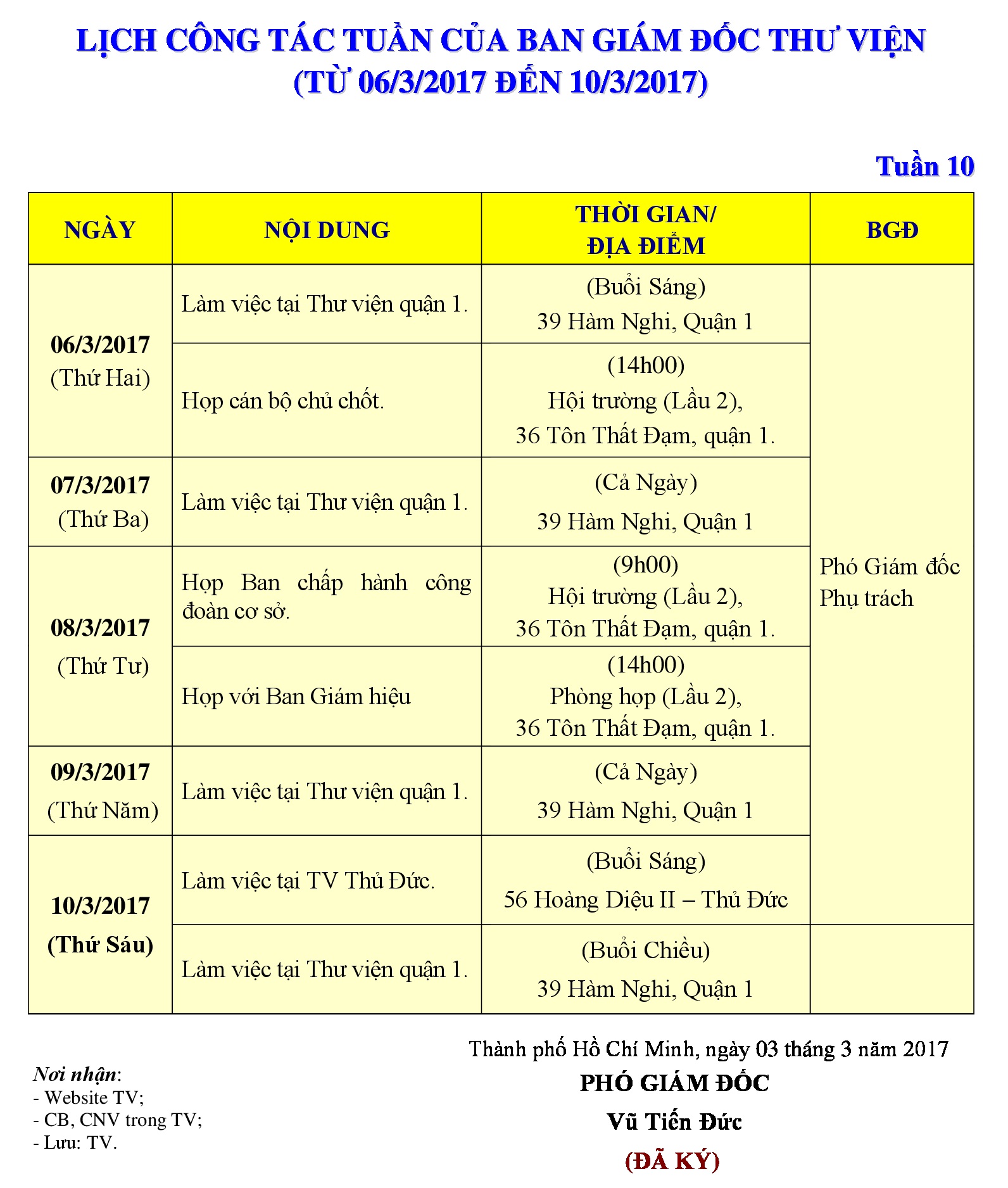 Lịch công tác tuần 10 của Ban Giám đốc Thư viện (từ 06/03/2017 đến 10/03/2017)