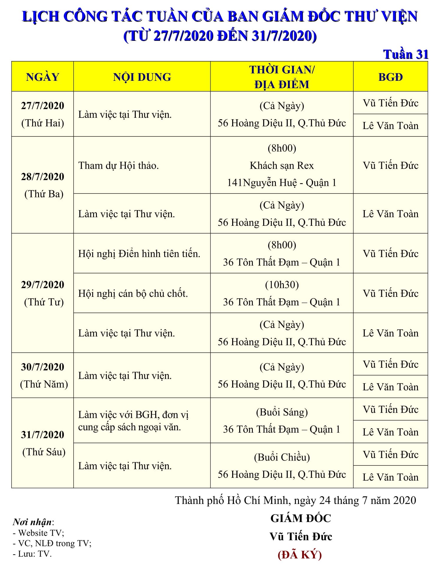 Lịch công tác tuần 31 của Ban Giám đốc Thư viện (từ 27/7/2020 đến 31/7/2020)