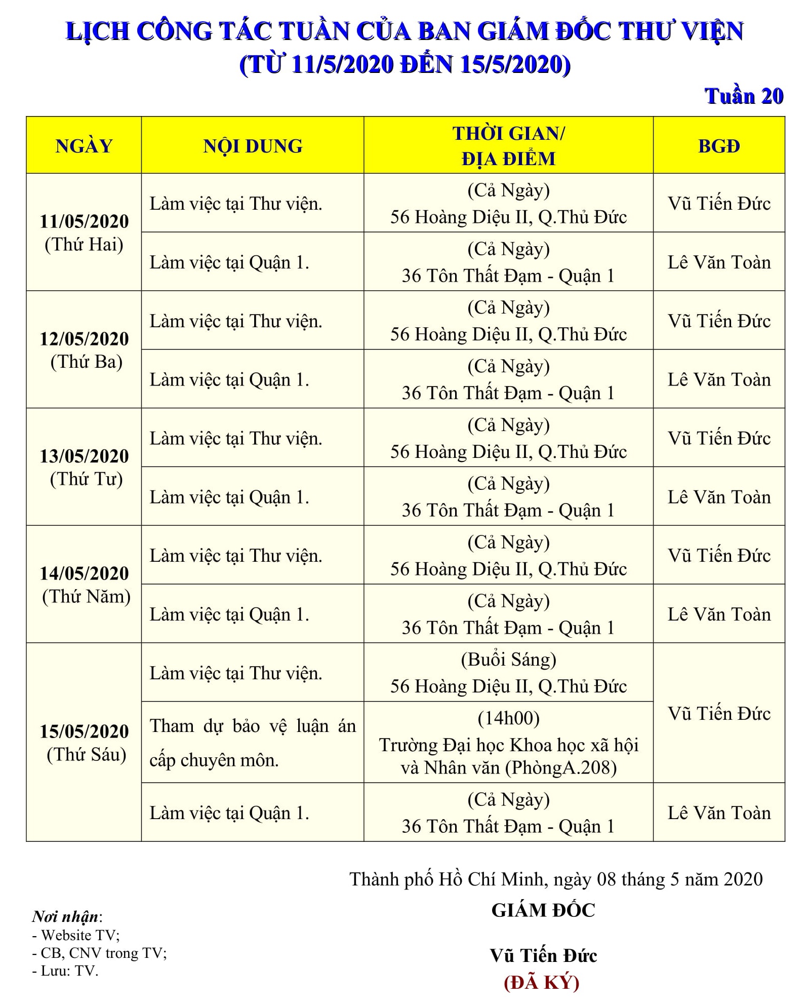 Lịch công tác tuần 20 của Ban Giám đốc Thư viện (từ 11/5/2020 đến 15/5/2020)