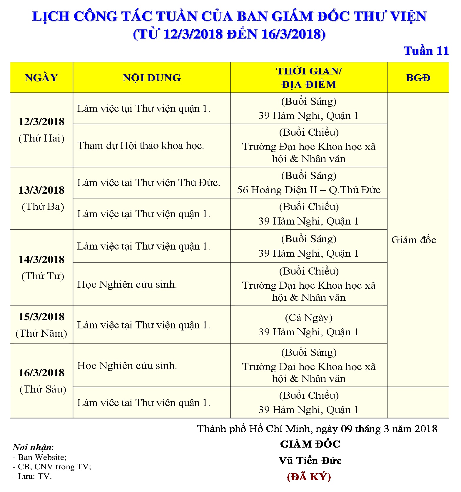 Lịch công tác tuần 11 của Ban Giám đốc Thư viện (từ 12/3/2018 đến 16/3/2018)
