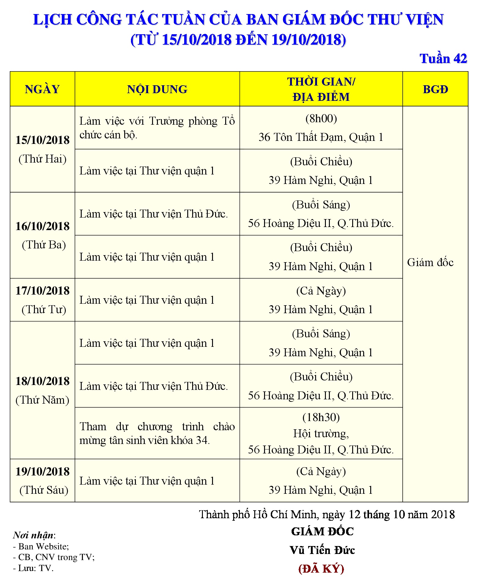 Lịch công tác tuần 42 của Ban Giám đốc Thư viện (từ 15/10/2018 đến 19/10/2018)