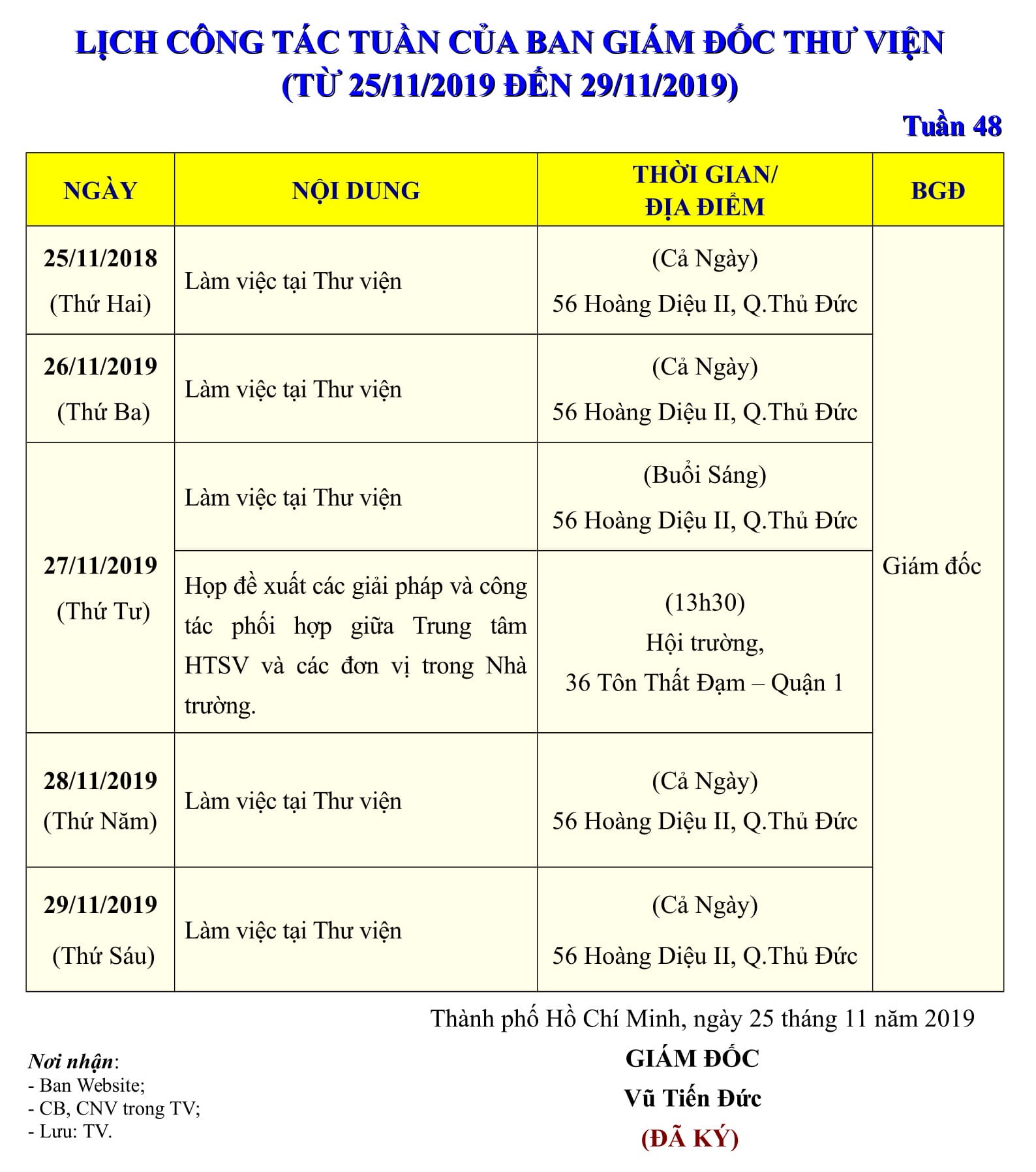 Lịch công tác tuần 48 của Ban Giám đốc Thư viện (từ 25/11/2019 đến 29/11/2019)