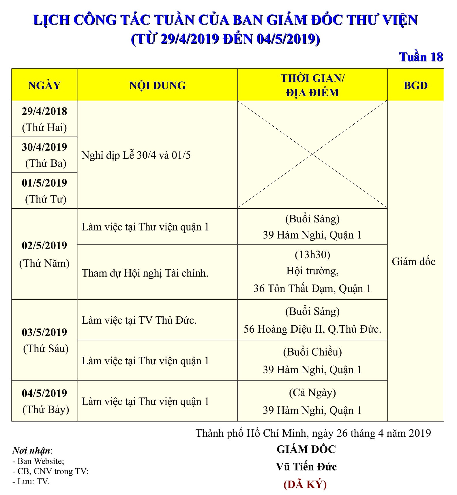 Lịch công tác tuần 18 của Ban Giám đốc Thư viện (từ 29/4/2019 đến 04/5/2019)