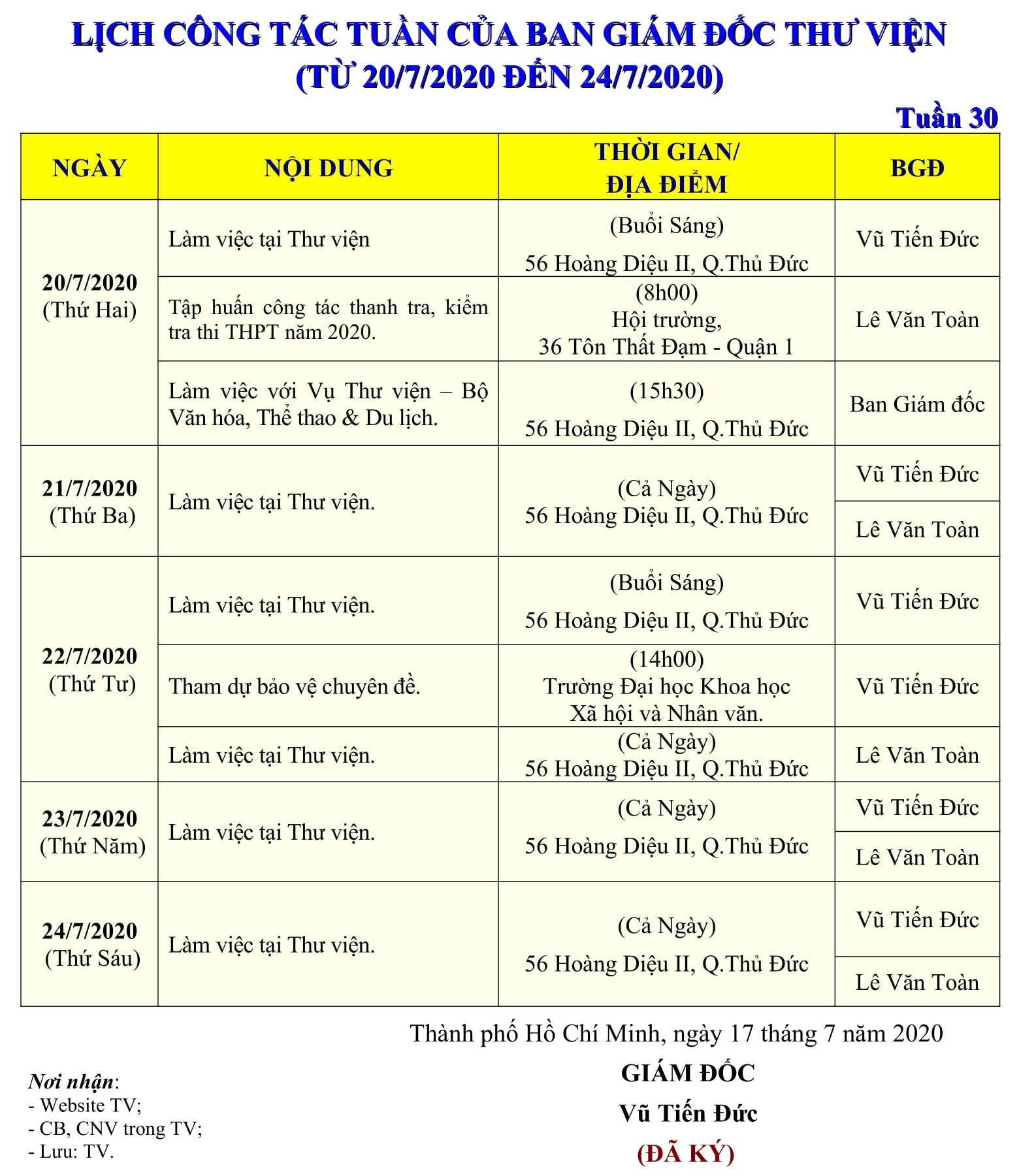 Lịch công tác tuần 30 của Ban Giám đốc Thư viện (từ 20/7/2020 đến 24/7/2020)