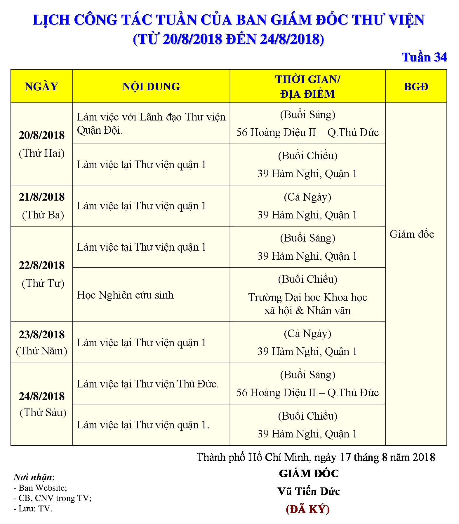 Lịch công tác tuần 34 của Ban Giám đốc Thư viện (từ 20/8/2018 đến 24/8/2018)