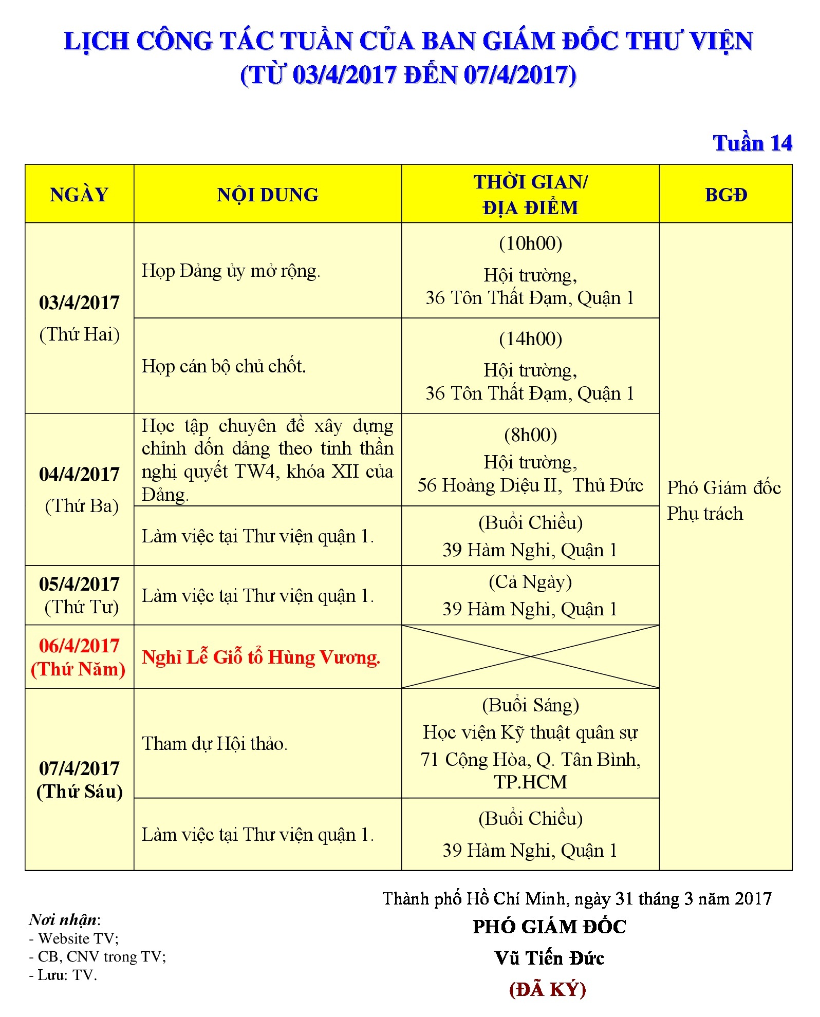 Lịch công tác tuần 14 của Ban Giám đốc Thư viện (từ 03/4/2017 đến 07/4/2017)