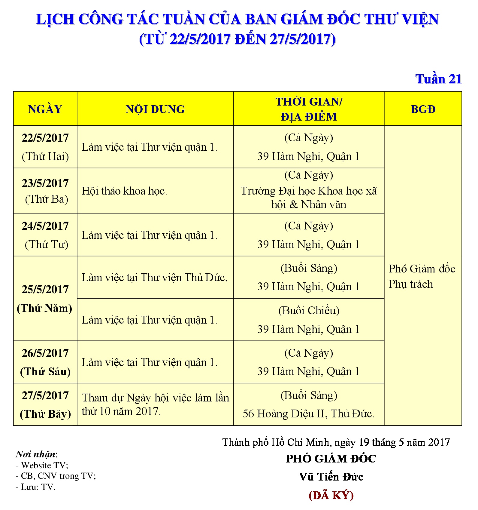 Lịch công tác tuần 21 của Ban Giám đốc Thư viện (từ 22/5/2017 đến 27/5/2017)