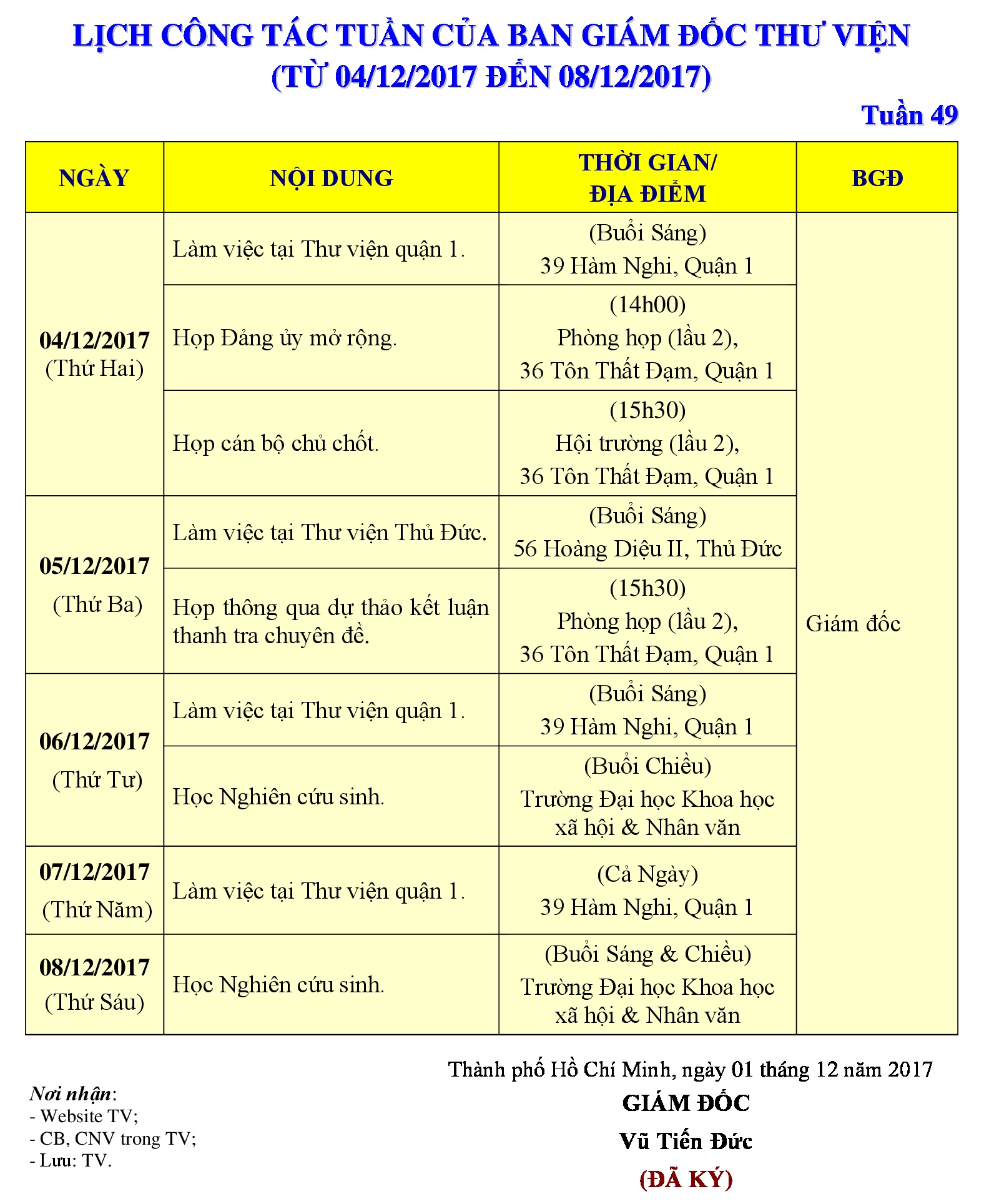 Lịch công tác tuần 49 của Ban Giám đốc Thư viện (từ 04/12/2017 đến 08/12/2017)
