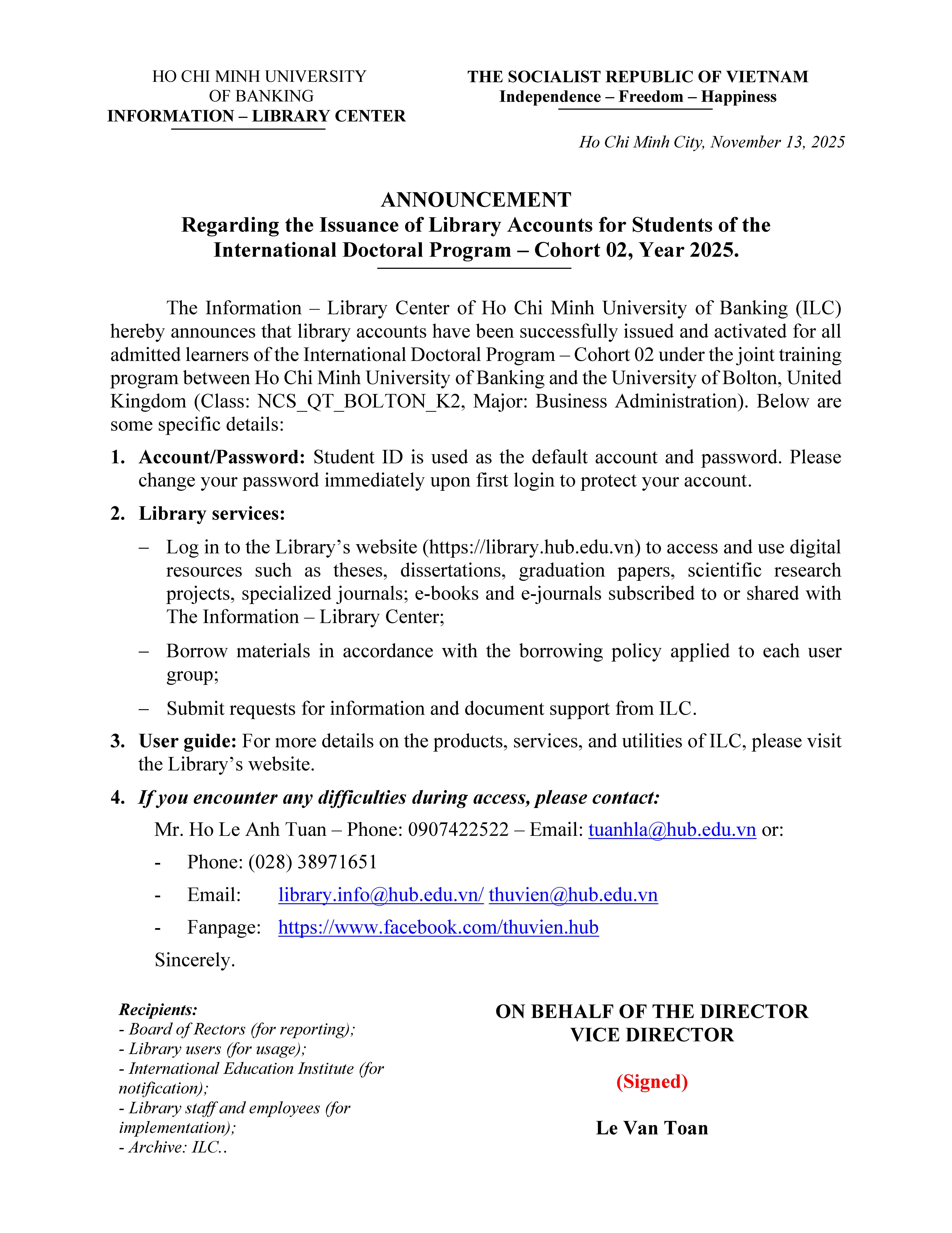 The Information – Library Center of Ho Chi Minh University of Banking hereby announces that library accounts have been successfully issued and activated for the admitted learners of the International Doctoral Program – Cohort 02 under the joint training program between Ho Chi Minh University of Banking and the University of Bolton, United Kingdom (Class: NCS_QT_BOLTON_K2, Major: Business Administration). Below are some specific details: