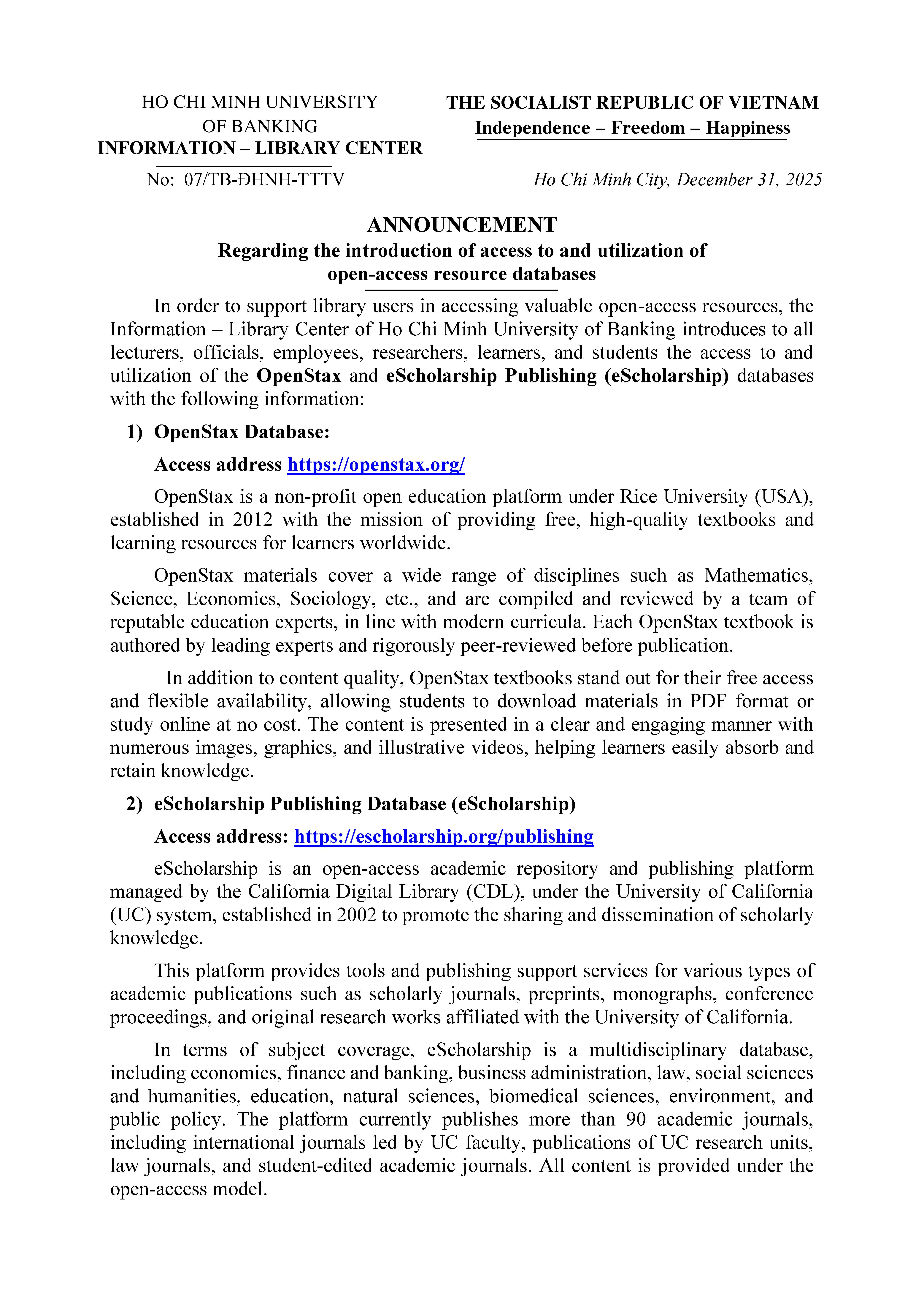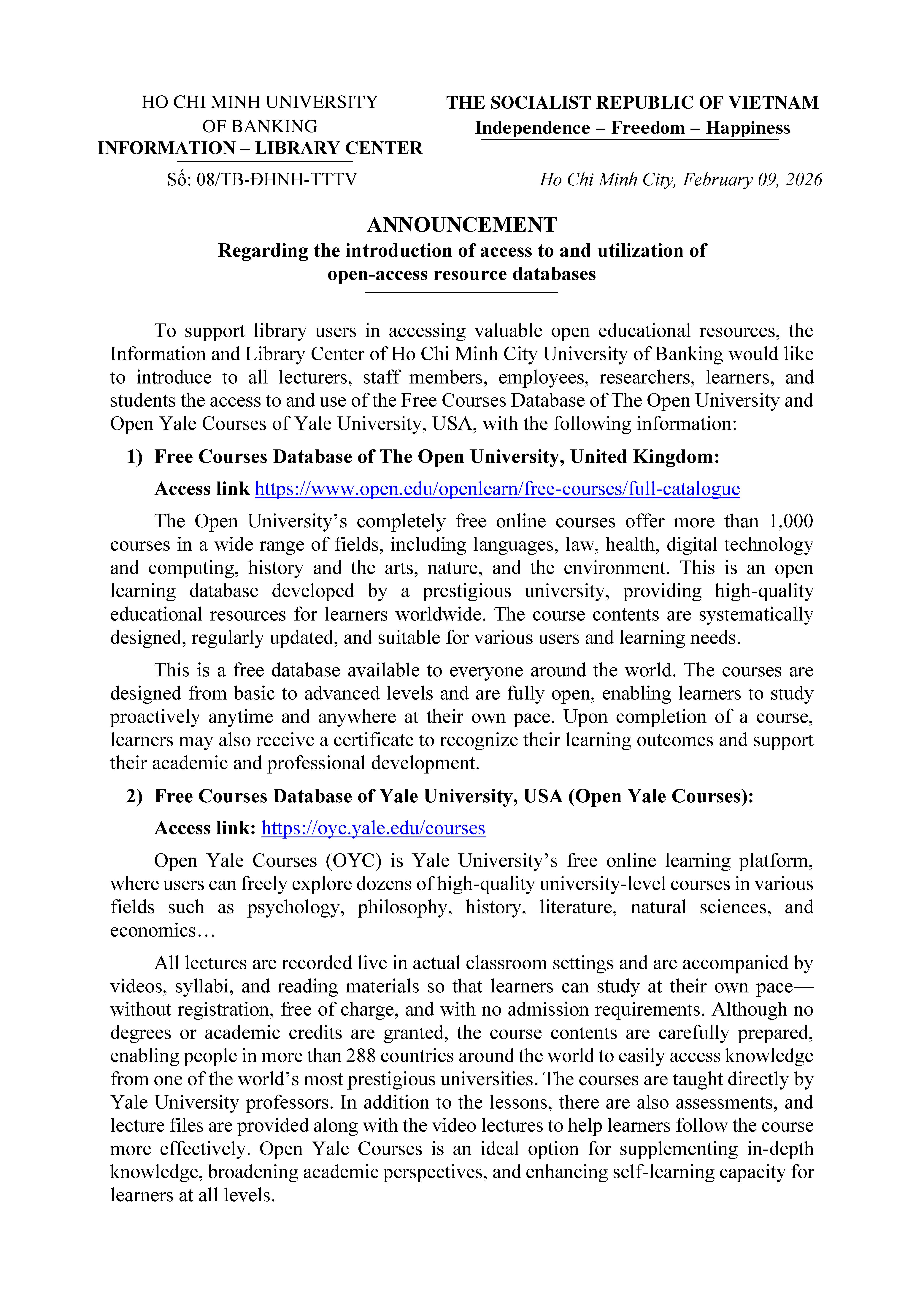 SAGE Journals, Emerald e-Journals , sciencedirect, iG Publishing và Springer are accessed by connecting to the School's network or following the Library's posted instructions for registration