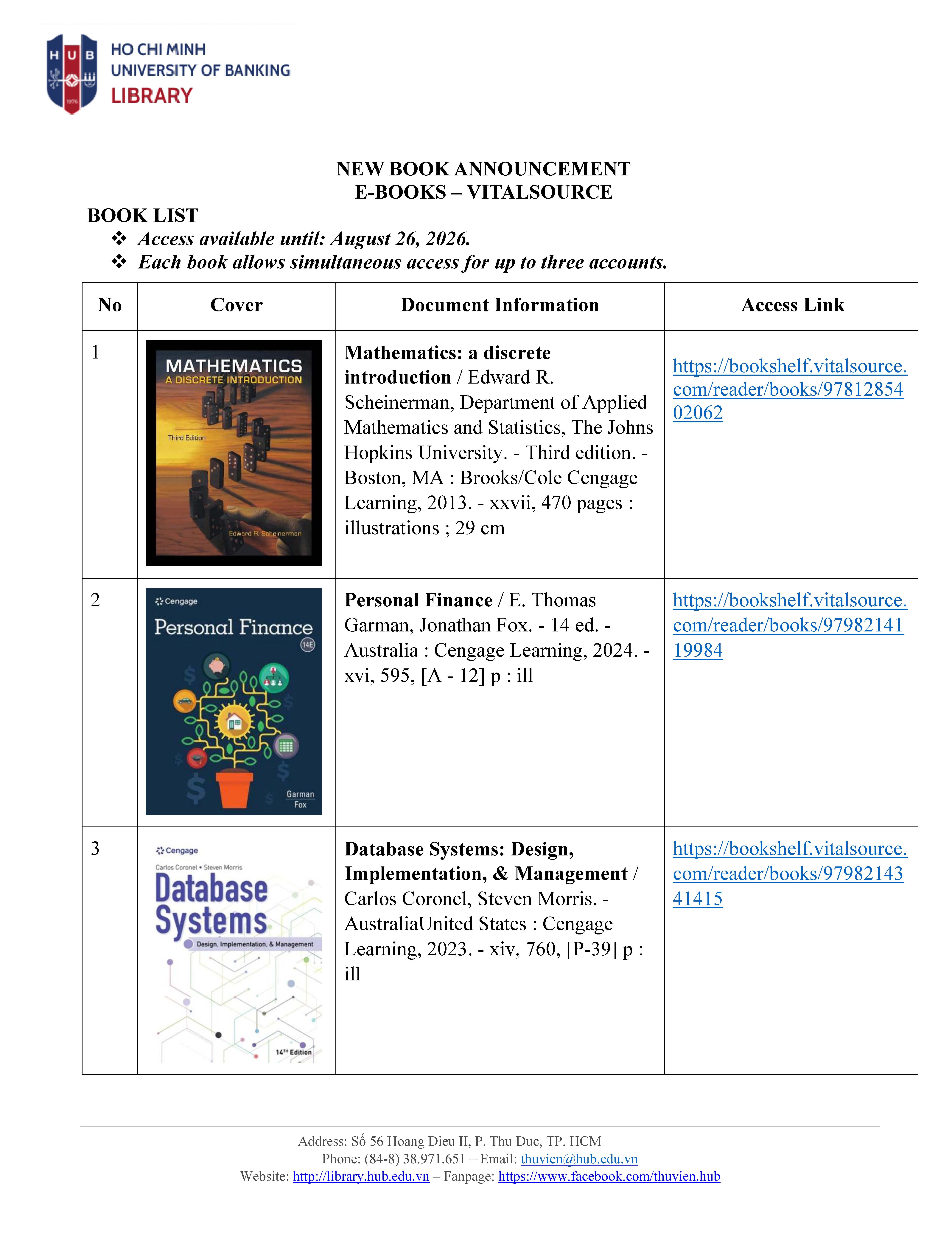 The Information – Library Center of the Banking University of Ho Chi Minh City is pleased to introduce a list of newly added eBooks on the VitalSource platform to support readers in their learning and research activities. (Details)