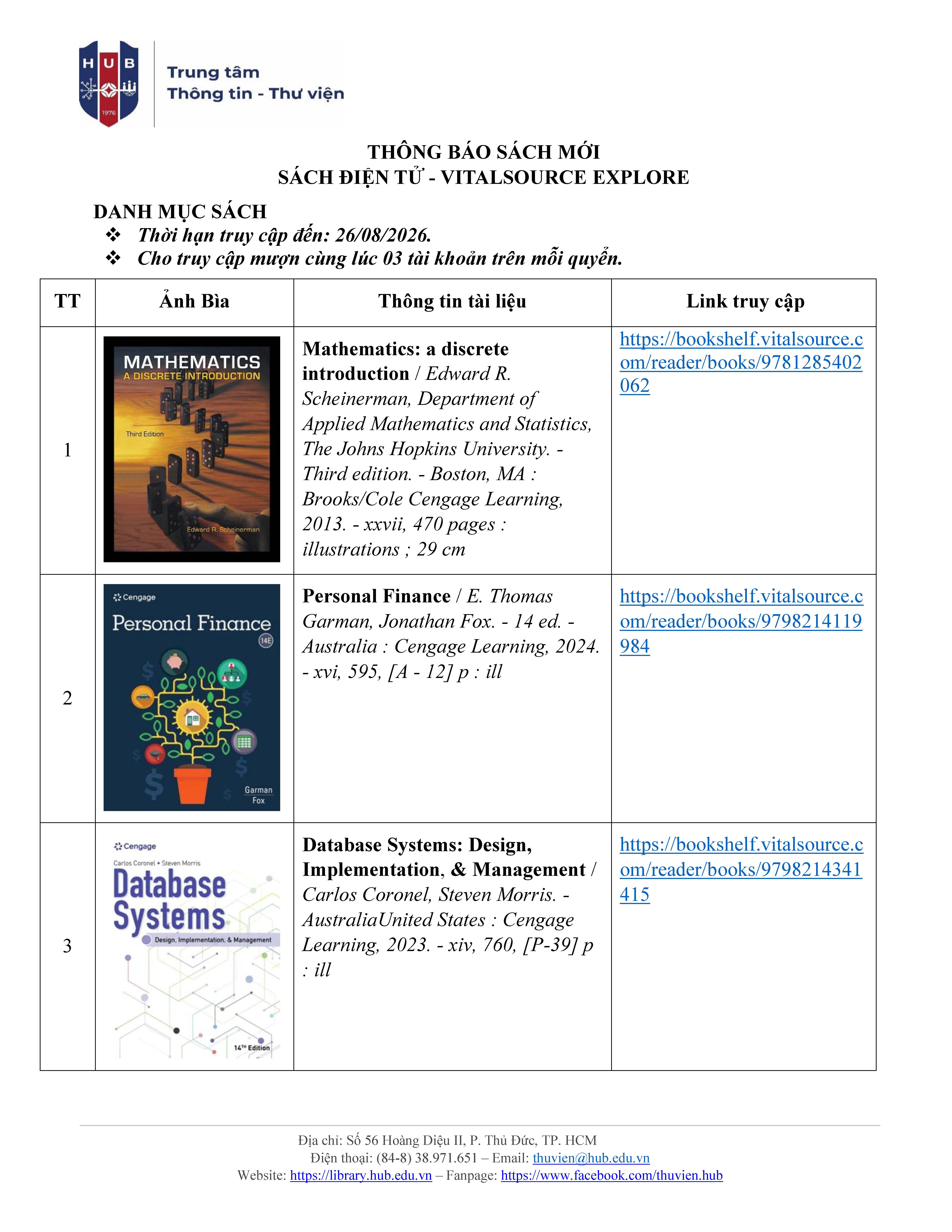 Nhằm giúp bạn đọc học tập – nghiên cứu hiệu quả hơn, Trung tâm Thông tin – Thư viện đã cập nhật sách mới và cung cấp hướng dẫn sử dụng VitalSource Explore.